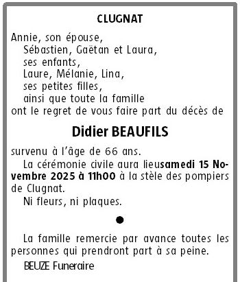 C’est avec une grande tristesse que nous vous annonçons le décès de Didier BEAUFILS survenu le lundi 10 novembre 2025 à Guéret. La cérémonie se déroulera le samedi 15 novembre 2025 à 11h00 à l’adresse suivante : Caserne - 7 Rue Jules Ferry - 23270 Clugnat.